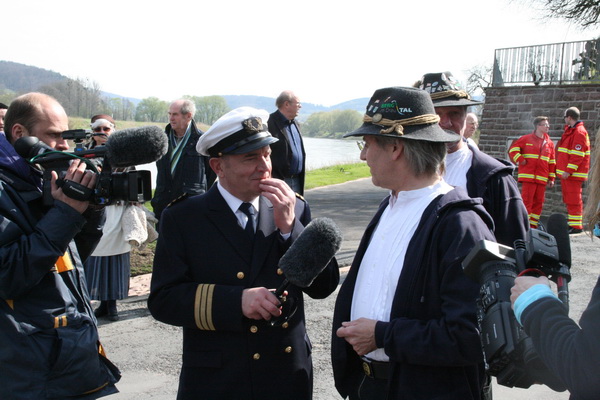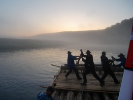 um 5.30 Uhr am Weserufer, begleitete die Flöße auf der ersten Etappe und